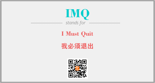 上述内容是“I Must Quit”作为“IMQ”的缩写,解释为“我必须退出”时的信息,以及英文缩略词IMQ所代表的英文单词,其对应的中文拼音、详细解释以及在英文中的流行度和相关分类、应用领域及应用示例等。