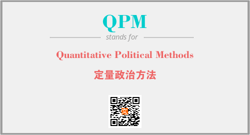 英文缩略词“QPM”经常作为“Quantitative Political Methods”的英文缩写来使用,中文表示:“定量政治方法”。本文将详细介绍英文缩写词QPM所代表英文单词,其对应的中文拼音、详细解释以及在英语中的流行度。此外,还有关于缩略词QPM的分类、应用领域及相关应用示例等。