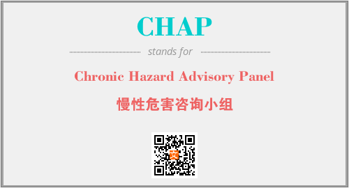 上述内容是“Chronic Hazard Advisory Panel”作为“CHAP”的缩写,解释为“慢性危害咨询小组”时的信息,以及英文缩略词CHAP所代表的英文单词,其对应的中文拼音、详细解释以及在英文中的流行度和相关分类、应用领域及应用示例等。