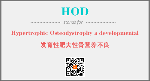 上述内容是“Hypertrophic Osteodystrophy a developmental”作为“HOD”的缩写,解释为“发育性肥大性骨营养不良”时的信息,以及英文缩略词HOD所代表的英文单词,其对应的中文拼音、详细解释以及在英文中的流行度和相关分类、应用领域及应用示例等。