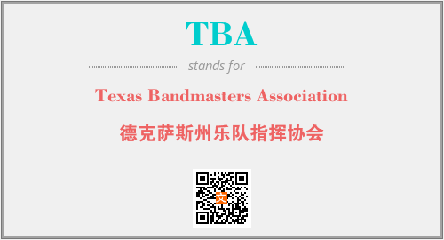 上述内容是“Texas Bandmasters Association”作为“TBA”的缩写,解释为“德克萨斯州乐队指挥协会”时的信息,以及英文缩略词TBA所代表的英文单词,其对应的中文拼音、详细解释以及在英文中的流行度和相关分类、应用领域及应用示例等。