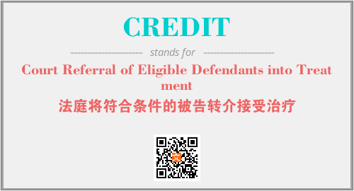 上述内容是“Court Referral of Eligible Defendants into Treatment”作为“CREDIT”的缩写,解释为“法庭将符合条件的被告转介接受治疗”时的信息,以及英文缩略词CREDIT所代表的英文单词,其对应的中文拼音、详细解释以及在英文中的流行度和相关分类、应用领域及应用示例等。
