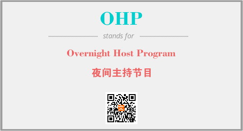 英文缩略词“OHP”经常作为“Overnight Host Program”的英文缩写来使用,中文表示:“夜间主持节目”。本文将详细介绍英文缩写词OHP所代表英文单词,其对应的中文拼音、详细解释以及在英语中的流行度。此外,还有关于缩略词OHP的分类、应用领域及相关应用示例等。
