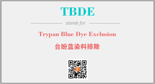上述内容是“Trypan Blue Dye Exclusion”作为“TBDE”的缩写,解释为“台盼蓝染料排除”时的信息,以及英文缩略词TBDE所代表的英文单词,其对应的中文拼音、详细解释以及在英文中的流行度和相关分类、应用领域及应用示例等。