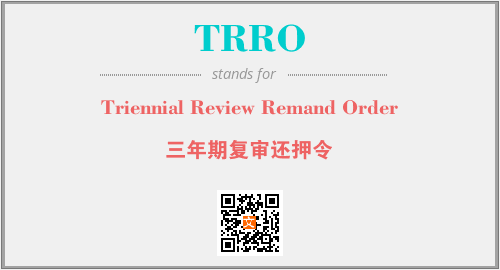 上述内容是“Triennial Review Remand Order”作为“TRRO”的缩写,解释为“三年期复审还押令”时的信息,以及英文缩略词TRRO所代表的英文单词,其对应的中文拼音、详细解释以及在英文中的流行度和相关分类、应用领域及应用示例等。