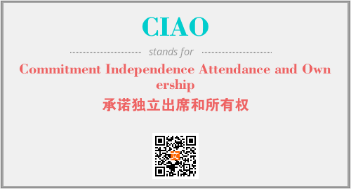 上述内容是“Commitment Independence Attendance and Ownership”作为“CIAO”的缩写,解释为“承诺独立出席和所有权”时的信息,以及英文缩略词CIAO所代表的英文单词,其对应的中文拼音、详细解释以及在英文中的流行度和相关分类、应用领域及应用示例等。