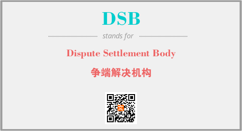 上述内容是“Dispute Settlement Body”作为“DSB”的缩写,解释为“争端解决机构”时的信息,以及英文缩略词DSB所代表的英文单词,其对应的中文拼音、详细解释以及在英文中的流行度和相关分类、应用领域及应用示例等。