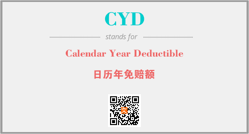 上述内容是“Calendar Year Deductible”作为“CYD”的缩写,解释为“日历年免赔额”时的信息,以及英文缩略词CYD所代表的英文单词,其对应的中文拼音、详细解释以及在英文中的流行度和相关分类、应用领域及应用示例等。