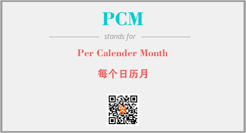 英文缩略词“PCM”经常作为“Per Calender Month”的英文缩写来使用,中文表示:“每个日历月”。本文将详细介绍英文缩写词PCM所代表英文单词,其对应的中文拼音、详细解释以及在英语中的流行度。此外,还有关于缩略词PCM的分类、应用领域及相关应用示例等。