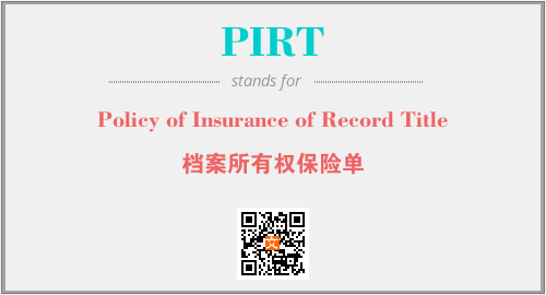 上述内容是“Policy of Insurance of Record Title”作为“PIRT”的缩写,解释为“档案所有权保险单”时的信息,以及英文缩略词PIRT所代表的英文单词,其对应的中文拼音、详细解释以及在英文中的流行度和相关分类、应用领域及应用示例等。