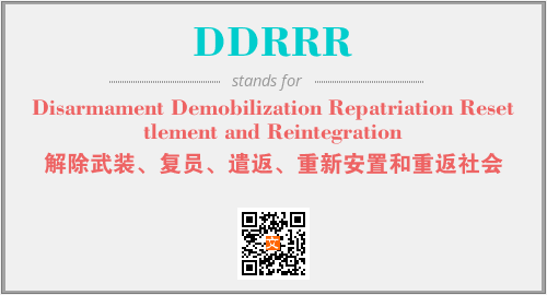 英文缩略词“DDRRR”经常作为“Disarmament Demobilization Repatriation Resettlement and Reintegration”的英文缩写来使用,中文表示:“解除武装、复员、遣返、重新安置和重返社会”。本文将详细介绍英文缩写词DDRRR所代表英文单词,其对应的中文拼音、详细解释以及在英语中的流行度。此外,还有关于缩略词DDRRR的分类、应用领域及相关应用示例等。