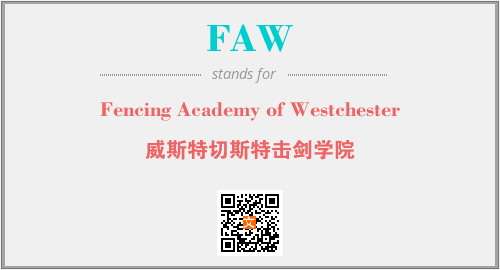 上述内容是“Fencing Academy of Westchester”作为“FAW”的缩写,解释为“威斯特切斯特击剑学院”时的信息,以及英文缩略词FAW所代表的英文单词,其对应的中文拼音、详细解释以及在英文中的流行度和相关分类、应用领域及应用示例等。