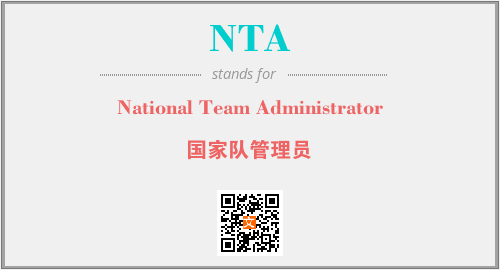 上述内容是“National Team Administrator”作为“NTA”的缩写,解释为“国家队管理员”时的信息,以及英文缩略词NTA所代表的英文单词,其对应的中文拼音、详细解释以及在英文中的流行度和相关分类、应用领域及应用示例等。