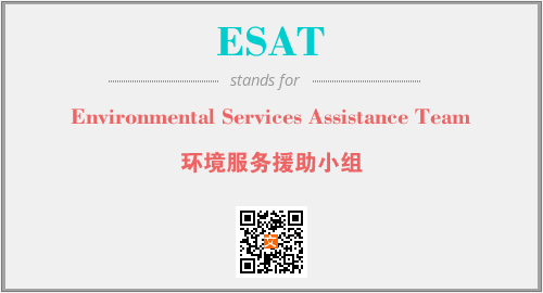 英文缩略词“ESAT”经常作为“Environmental Services Assistance Team”的英文缩写来使用,中文表示:“环境服务援助小组”。本文将详细介绍英文缩写词ESAT所代表英文单词,其对应的中文拼音、详细解释以及在英语中的流行度。此外,还有关于缩略词ESAT的分类、应用领域及相关应用示例等。