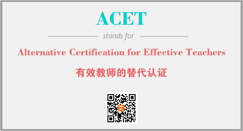 上述内容是“Alternative Certification for Effective Teachers”作为“ACET”的缩写,解释为“有效教师的替代认证”时的信息,以及英文缩略词ACET所代表的英文单词,其对应的中文拼音、详细解释以及在英文中的流行度和相关分类、应用领域及应用示例等。