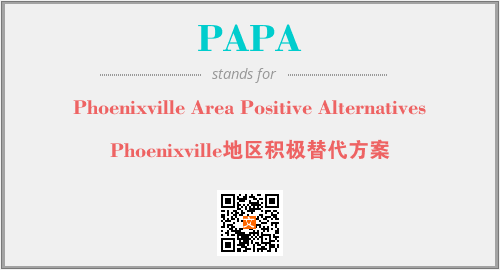 上述内容是“Phoenixville Area Positive Alternatives”作为“PAPA”的缩写,解释为“Phoenixville地区积极替代方案”时的信息,以及英文缩略词PAPA所代表的英文单词,其对应的中文拼音、详细解释以及在英文中的流行度和相关分类、应用领域及应用示例等。
