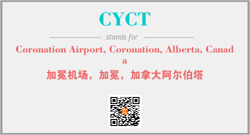 上述内容是“Coronation Airport, Coronation, Alberta, Canada”作为“CYCT”的缩写,解释为“加冕机场,加冕,加拿大阿尔伯塔”时的信息,以及英文缩略词CYCT所代表的英文单词,其对应的中文拼音、详细解释以及在英文中的流行度和相关分类、应用领域及应用示例等。