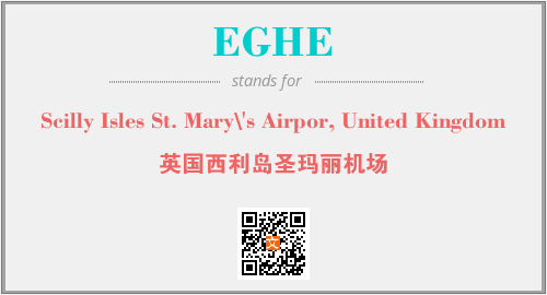 英文缩略词“EGHE”经常作为“Scilly Isles St. Mary\'s Airpor, United Kingdom”的英文缩写来使用,中文表示:“英国西利岛圣玛丽机场”。本文将详细介绍英文缩写词EGHE所代表英文单词,其对应的中文拼音、详细解释以及在英语中的流行度。此外,还有关于缩略词EGHE的分类、应用领域及相关应用示例等。