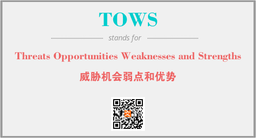 英文缩略词“TOWS”经常作为“Threats Opportunities Weaknesses and Strengths”的英文缩写来使用,中文表示:“威胁机会弱点和优势”。本文将详细介绍英文缩写词TOWS所代表英文单词,其对应的中文拼音、详细解释以及在英语中的流行度。此外,还有关于缩略词TOWS的分类、应用领域及相关应用示例等。