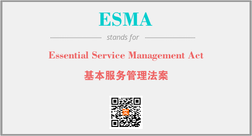 上述内容是“Essential Service Management Act”作为“ESMA”的缩写,解释为“基本服务管理法案”时的信息,以及英文缩略词ESMA所代表的英文单词,其对应的中文拼音、详细解释以及在英文中的流行度和相关分类、应用领域及应用示例等。