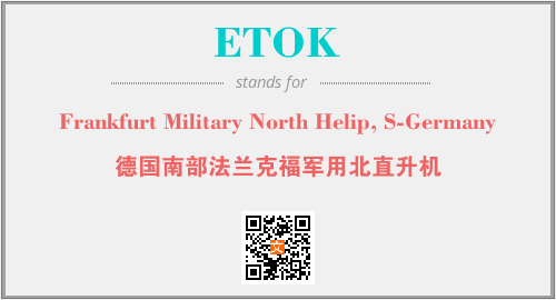 英文缩略词“ETOK”经常作为“Frankfurt Military North Helip, S-Germany”的英文缩写来使用,中文表示:“德国南部法兰克福军用北直升机”。本文将详细介绍英文缩写词ETOK所代表英文单词,其对应的中文拼音、详细解释以及在英语中的流行度。此外,还有关于缩略词ETOK的分类、应用领域及相关应用示例等。