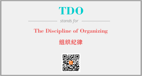 英文缩略词“TDO”经常作为“The Discipline of Organizing”的英文缩写来使用,中文表示:“组织纪律”。本文将详细介绍英文缩写词TDO所代表英文单词,其对应的中文拼音、详细解释以及在英语中的流行度。此外,还有关于缩略词TDO的分类、应用领域及相关应用示例等。