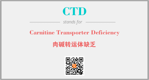 上述内容是“Carnitine Transporter Deficiency”作为“CTD”的缩写,解释为“肉碱转运体缺乏”时的信息,以及英文缩略词CTD所代表的英文单词,其对应的中文拼音、详细解释以及在英文中的流行度和相关分类、应用领域及应用示例等。