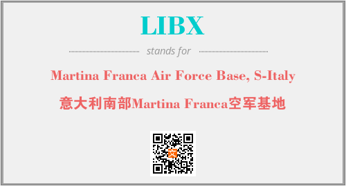 英文缩略词“LIBX”经常作为“Martina Franca Air Force Base, S-Italy”的英文缩写来使用,中文表示:“意大利南部Martina Franca空军基地”。本文将详细介绍英文缩写词LIBX所代表英文单词,其对应的中文拼音、详细解释以及在英语中的流行度。此外,还有关于缩略词LIBX的分类、应用领域及相关应用示例等。