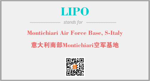 英文缩略词“LIPO”经常作为“Montichiari Air Force Base, S-Italy”的英文缩写来使用,中文表示:“意大利南部Montichiari空军基地”。本文将详细介绍英文缩写词LIPO所代表英文单词,其对应的中文拼音、详细解释以及在英语中的流行度。此外,还有关于缩略词LIPO的分类、应用领域及相关应用示例等。