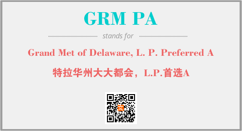 上述内容是“Grand Met of Delaware, L. P. Preferred A”作为“GRM PA”的缩写,解释为“特拉华州大大都会,L.P.首选A”时的信息,以及英文缩略词GRM PA所代表的英文单词,其对应的中文拼音、详细解释以及在英文中的流行度和相关分类、应用领域及应用示例等。