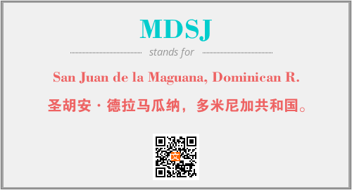上述内容是“San Juan de la Maguana, Dominican R.”作为“MDSJ”的缩写,解释为“圣胡安·德拉马瓜纳,多米尼加共和国。”时的信息,以及英文缩略词MDSJ所代表的英文单词,其对应的中文拼音、详细解释以及在英文中的流行度和相关分类、应用领域及应用示例等。