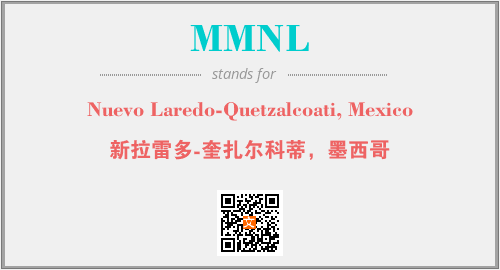 上述内容是“Nuevo Laredo-Quetzalcoati, Mexico”作为“MMNL”的缩写,解释为“新拉雷多-奎扎尔科蒂,墨西哥”时的信息,以及英文缩略词MMNL所代表的英文单词,其对应的中文拼音、详细解释以及在英文中的流行度和相关分类、应用领域及应用示例等。