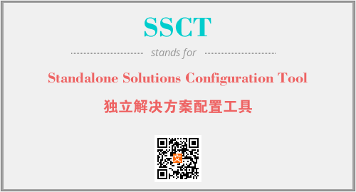 英文缩略词“SSCT”经常作为“Standalone Solutions Configuration Tool”的英文缩写来使用,中文表示:“独立解决方案配置工具”。本文将详细介绍英文缩写词SSCT所代表英文单词,其对应的中文拼音、详细解释以及在英语中的流行度。此外,还有关于缩略词SSCT的分类、应用领域及相关应用示例等。