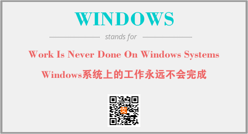 上述内容是“Work Is Never Done On Windows Systems”作为“WINDOWS”的缩写,解释为“Windows系统上的工作永远不会完成”时的信息,以及英文缩略词WINDOWS所代表的英文单词,其对应的中文拼音、详细解释以及在英文中的流行度和相关分类、应用领域及应用示例等。