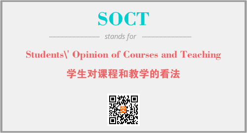 上述内容是“Students\' Opinion of Courses and Teaching”作为“SOCT”的缩写,解释为“学生对课程和教学的看法”时的信息,以及英文缩略词SOCT所代表的英文单词,其对应的中文拼音、详细解释以及在英文中的流行度和相关分类、应用领域及应用示例等。