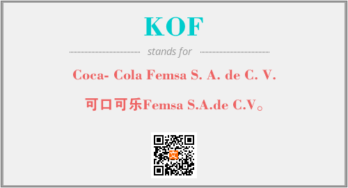 上述内容是“Coca- Cola Femsa S. A. de C. V.”作为“KOF”的缩写,解释为“可口可乐Femsa S.A.de C.V。”时的信息,以及英文缩略词KOF所代表的英文单词,其对应的中文拼音、详细解释以及在英文中的流行度和相关分类、应用领域及应用示例等。