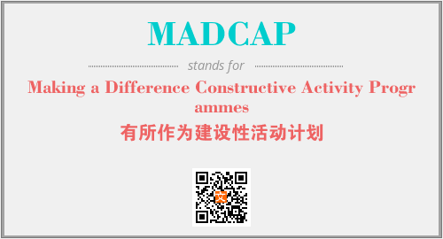 上述内容是“Making a Difference Constructive Activity Programmes”作为“MADCAP”的缩写,解释为“有所作为建设性活动计划”时的信息,以及英文缩略词MADCAP所代表的英文单词,其对应的中文拼音、详细解释以及在英文中的流行度和相关分类、应用领域及应用示例等。