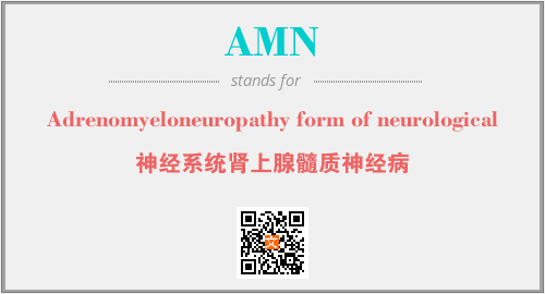 上述内容是“Adrenomyeloneuropathy form of neurological”作为“AMN”的缩写,解释为“神经系统肾上腺髓质神经病”时的信息,以及英文缩略词AMN所代表的英文单词,其对应的中文拼音、详细解释以及在英文中的流行度和相关分类、应用领域及应用示例等。