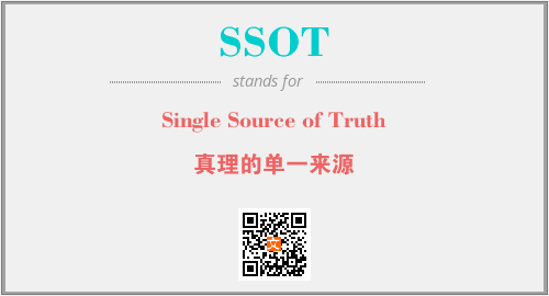 英文缩略词“SSOT”经常作为“Single Source of Truth”的英文缩写来使用,中文表示:“真理的单一来源”。本文将详细介绍英文缩写词SSOT所代表英文单词,其对应的中文拼音、详细解释以及在英语中的流行度。此外,还有关于缩略词SSOT的分类、应用领域及相关应用示例等。