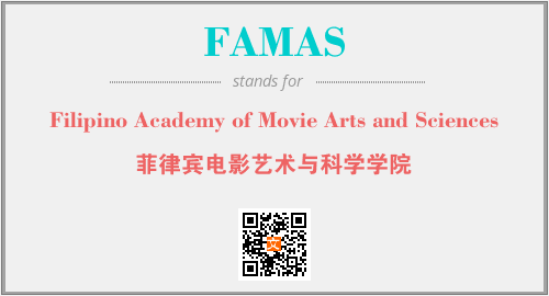 上述内容是“Filipino Academy of Movie Arts and Sciences”作为“FAMAS”的缩写,解释为“菲律宾电影艺术与科学学院”时的信息,以及英文缩略词FAMAS所代表的英文单词,其对应的中文拼音、详细解释以及在英文中的流行度和相关分类、应用领域及应用示例等。