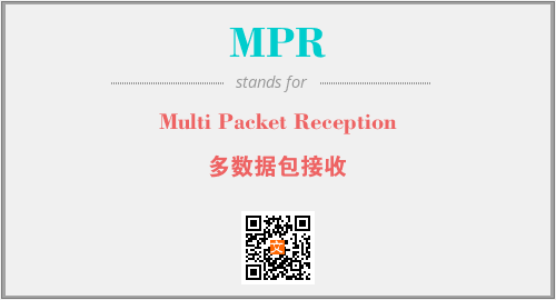 上述内容是“Multi Packet Reception”作为“MPR”的缩写,解释为“多数据包接收”时的信息,以及英文缩略词MPR所代表的英文单词,其对应的中文拼音、详细解释以及在英文中的流行度和相关分类、应用领域及应用示例等。