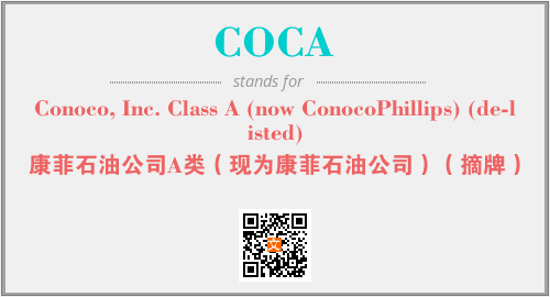 上述内容是“Conoco, Inc. Class A (now ConocoPhillips) (de-listed)”作为“COCA”的缩写,解释为“康菲石油公司A类(现为康菲石油公司)(摘牌)”时的信息,以及英文缩略词COCA所代表的英文单词,其对应的中文拼音、详细解释以及在英文中的流行度和相关分类、应用领域及应用示例等。