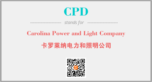 上述内容是“Carolina Power and Light Company”作为“CPD”的缩写,解释为“卡罗莱纳电力和照明公司”时的信息,以及英文缩略词CPD所代表的英文单词,其对应的中文拼音、详细解释以及在英文中的流行度和相关分类、应用领域及应用示例等。
