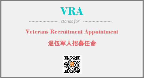 上述内容是“Veterans Recruitment Appointment”作为“VRA”的缩写,解释为“退伍军人招募任命”时的信息,以及英文缩略词VRA所代表的英文单词,其对应的中文拼音、详细解释以及在英文中的流行度和相关分类、应用领域及应用示例等。
