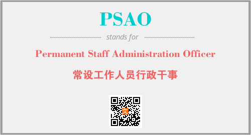 上述内容是“Permanent Staff Administration Officer”作为“PSAO”的缩写,解释为“常设工作人员行政干事”时的信息,以及英文缩略词PSAO所代表的英文单词,其对应的中文拼音、详细解释以及在英文中的流行度和相关分类、应用领域及应用示例等。
