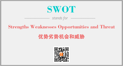 英文缩略词“SWOT”经常作为“Strengths Weaknesses Opportunities and Threat”的英文缩写来使用,中文表示:“优势劣势机会和威胁”。本文将详细介绍英文缩写词SWOT所代表英文单词,其对应的中文拼音、详细解释以及在英语中的流行度。此外,还有关于缩略词SWOT的分类、应用领域及相关应用示例等。