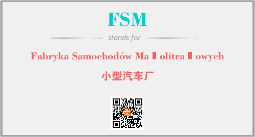 英文缩略词“FSM”经常作为“Fabryka Samochodów Małolitrażowych”的英文缩写来使用,中文表示:“小型汽车厂”。本文将详细介绍英文缩写词FSM所代表英文单词,其对应的中文拼音、详细解释以及在英语中的流行度。此外,还有关于缩略词FSM的分类、应用领域及相关应用示例等。