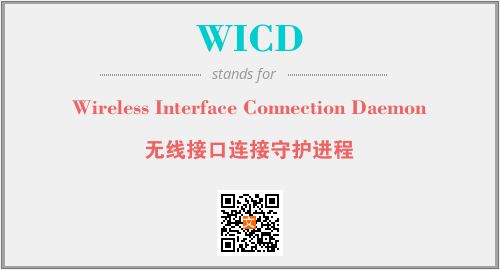 英文缩略词“WICD”经常作为“Wireless Interface Connection Daemon”的英文缩写来使用,中文表示:“无线接口连接守护进程”。本文将详细介绍英文缩写词WICD所代表英文单词,其对应的中文拼音、详细解释以及在英语中的流行度。此外,还有关于缩略词WICD的分类、应用领域及相关应用示例等。