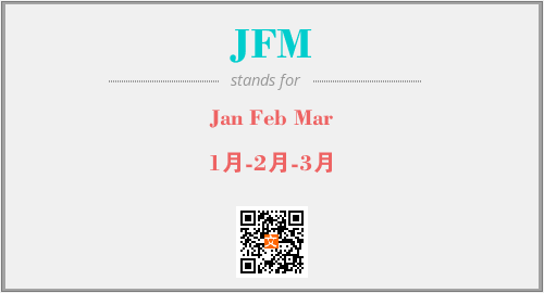 英文缩略词“JFM”经常作为“Jan Feb Mar”的英文缩写来使用,中文表示:“1月-2月-3月”。本文将详细介绍英文缩写词JFM所代表英文单词,其对应的中文拼音、详细解释以及在英语中的流行度。此外,还有关于缩略词JFM的分类、应用领域及相关应用示例等。