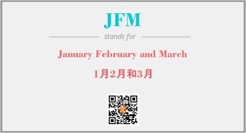 英文缩略词“JFM”经常作为“January February and March”的英文缩写来使用,中文表示:“1月2月和3月”。本文将详细介绍英文缩写词JFM所代表英文单词,其对应的中文拼音、详细解释以及在英语中的流行度。此外,还有关于缩略词JFM的分类、应用领域及相关应用示例等。